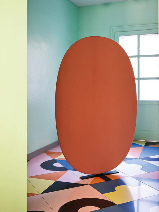 材質: 屏風由兩片 16 mm 膠合 MDF 密迪板組成,外層為軟墊,底座為金屬烤漆