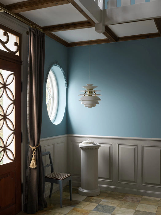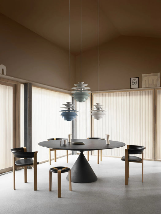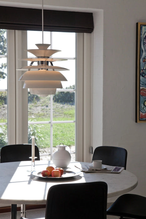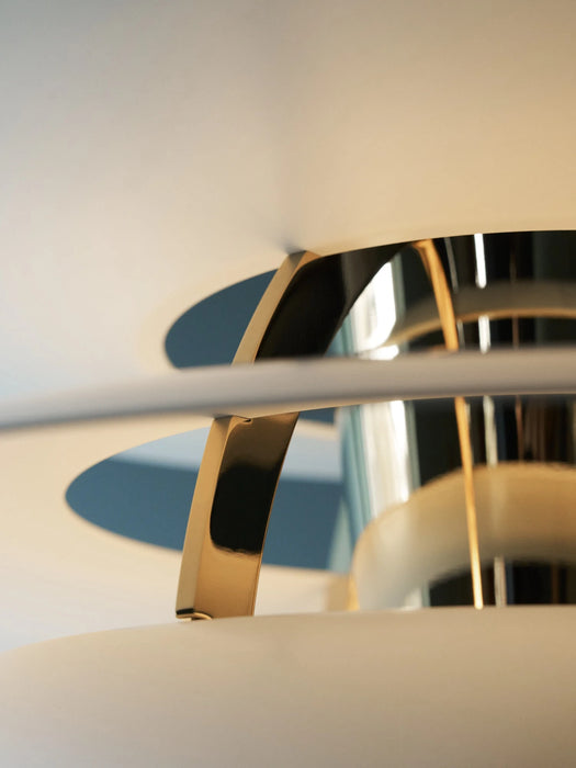 看起來像百頁窗一樣的 PH Snowball 雪球吊燈,採用了磨砂噴漆的葉片,燈葉內側以粗糙處理,表面以亮面處理,從而讓燈光以更舒適的色澤從上而下透出,散發出舒服的無眩散射光,燈光亮起時,燈葉上半部較亮,漸層往下半部則變暗,令整個房間的環境更為柔和融洽,形成一幅美麗自然的立體景緻。