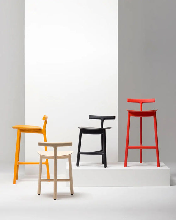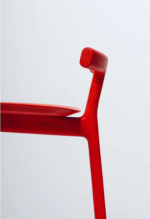 出自英國 Industrial Facility 團隊所設計,T字背把、三腳座椅,無使用任何螺絲或金屬零件所製成,創作靈感來自 Roots,向下紮根定根穩固,概念傳達於此,T 字背把造型提供靠背還可懸掛衣物,兼具輕巧美觀,結構可不馬虎,可是經由 BIFMA 美國商用傢俱製造商協會進行檢測,取得認證後得以量化生產,由此增加產品的可信度。