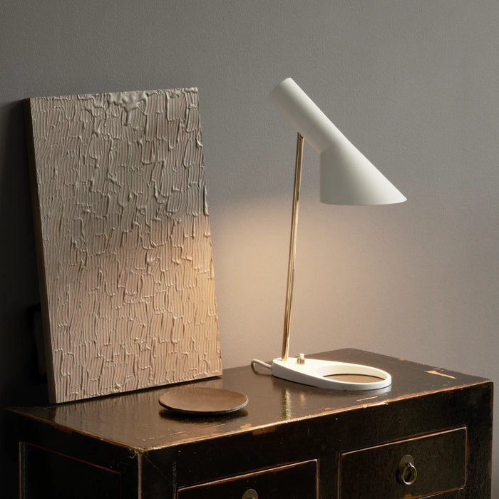 AJ 系列是 Arne Jacobsen 於 1957 年為丹麥哥本哈根的 SAS Royal Hotel 所設計,其特色在於燈頭部份的不對稱式設計風格,燈罩部分可上下調整投射角度;燈座之處簍空的圓孔,原先設計是留給煙灰缸的置放,獨到的設計巧思與美感,雋永且不退流行。