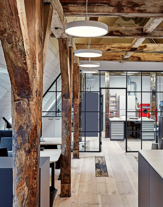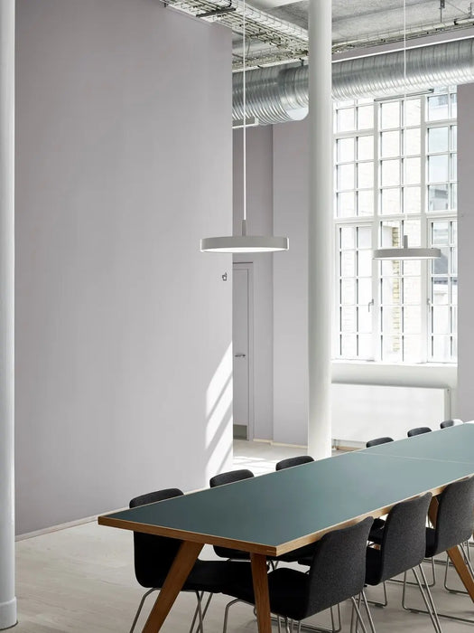 LP 圓形纖細吊燈提供三種不同的尺寸、三種顏色, 適用於簡約至上的室內空間,是開放式辦公室、接待區和會議室最理想選擇,為每個場域賦予自我風格氣質的同時,保留一致的美觀。