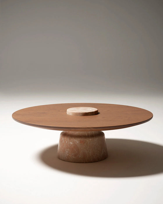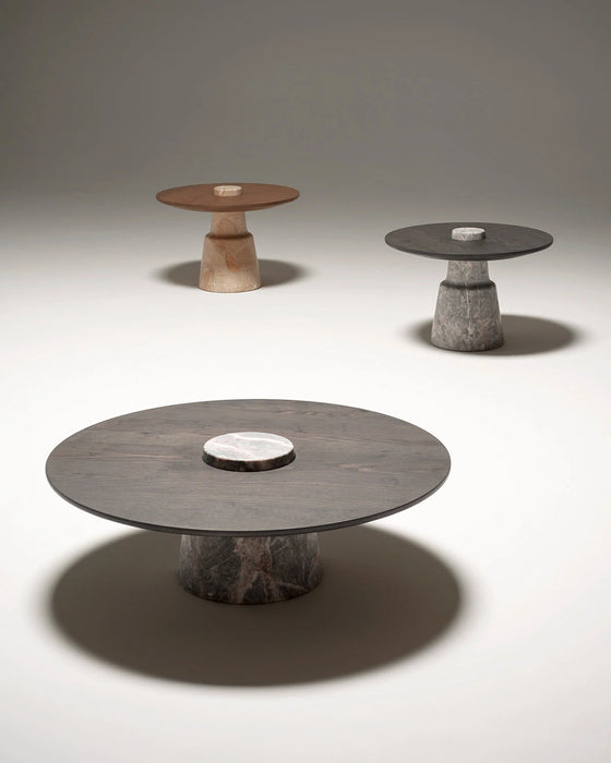 Mill Low Table 詮釋著兩個元素相互摩擦,直到完美地結合在一起的過程,Monica Förster 重新演繹了具有中央支撐底座的經典茶几,在木質平坦光滑的表面中央以基座的大理石基座向上穿透,形塑出如石磨般的特殊造型,木質與石材的自然美感結合在一起,創造出獨特形狀和紋路,完美呈現簡約優雅的設計。